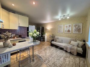 Без дополнительной оплаты в квартире остаются кухонный гарнитур, электроплита, холодильник, СВЧ-печь, угловой диванчик и стол на кухне; тумба, шкаф, вешалка и зеркало в прихожей.
