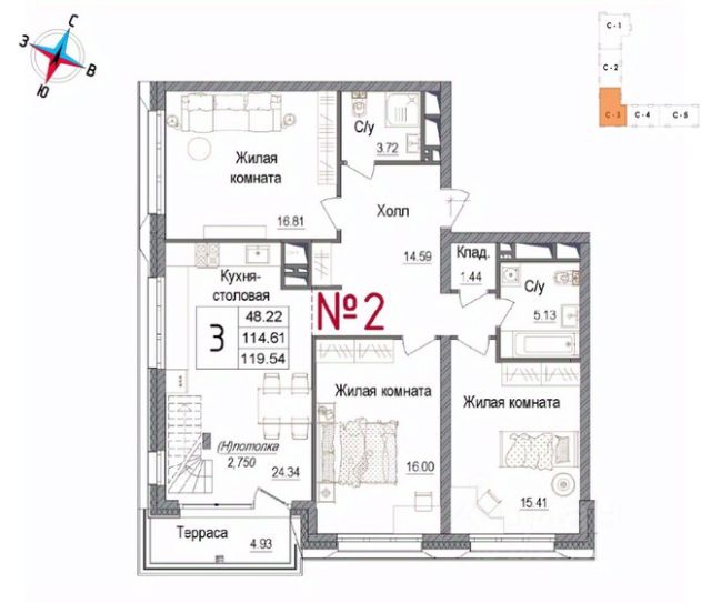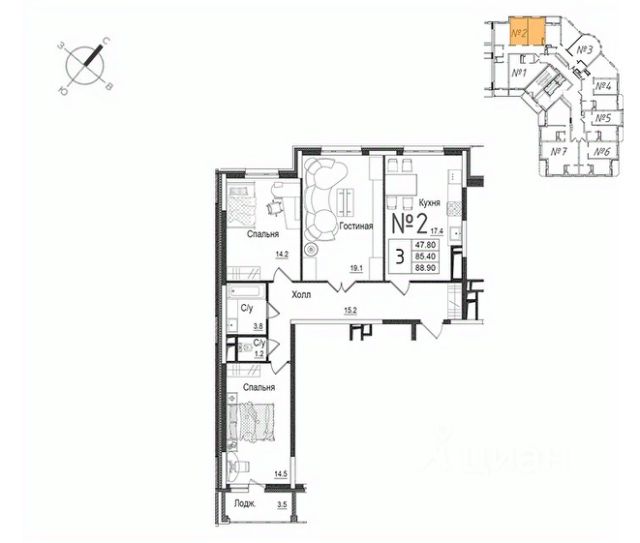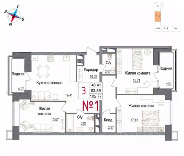 Продаётся 3-комнатная квартира в строящемся доме (Корпус 1), срок сдачи: IV-кв. 2027, общей площадью 105.35 кв.м., на 17 этаже. ЖК "Авиатор-2" - жилой комплекс с подземной автостоянкой и встроенными помещениями общественного назначения.