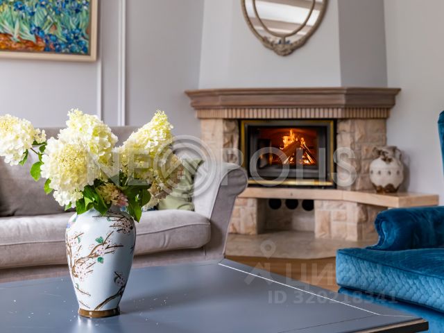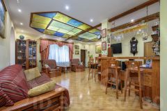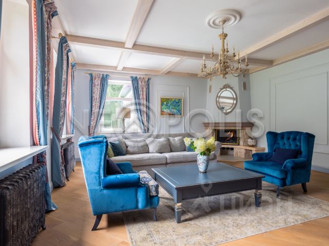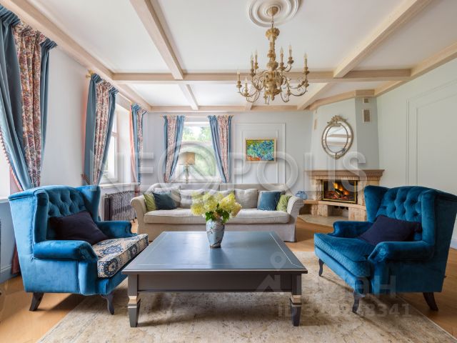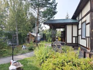 Описание внутренней отделки: внутренняя отделка дома выполнена в лучших традициях русского зодчества из ценных пород дерева, бересты каждая деталь привлекает внимание: изящные наличники, эффектные потолочные карнизы, мебель и декор, созданные мастерами вручную. Стены отделаны эстетичным кедровым лафетом, между венцами проложен канат. На первом этаже уложен оригинальный наборный пол из спилов различных пород дерева, в спальнях инженерная доска. Потолок выполнен из массива лиственницы. В гостиной потолок из кедра в виде лучей без единого стыка. Установлены межкомнатные двери из кедра, входные двери со световыми окнами, декорированные снаружи корой дерева. Интерьер дополняют выключатели в стиле "ретро" (разводка наружная, открытая), пейзажная живопись, столики и тумбы из древесных ветвей. На верхние этажи ведут деревянные лестницы с художественным исполнением ограждения из веток и стволов дерева. На первом этаже и в санузлах тёплые полы, интегрированы внутрипольные конвекторы Mohlenhoff с принудительной конвекцией. Пол террасы выложен архитектурным бетоном с имитацией среза пенька с заполнением промежутков по технологии "каменный ковер".
