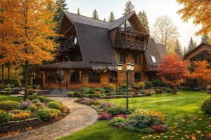 Дом выполнен в стиле гибридный канадский деревянный дом Шале.