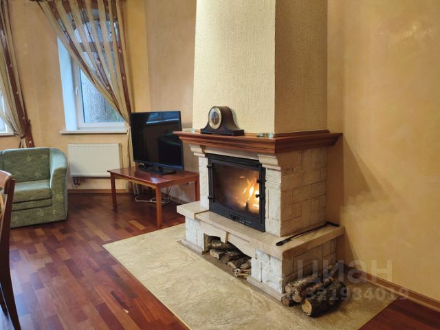 Камин с мраморной отделкой и стеклянной дверцей.
