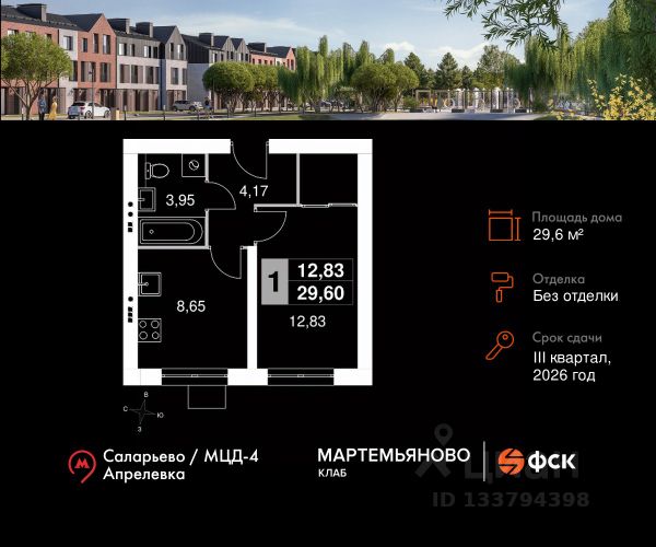 Прямая продажа от застройщика! Жилой Комплекс класса Комфорт. Продаётся 1-к квартира 34 общей площадью 29.6 кв.м на 2-м этаже 3 этажного дома. Без отделки. Расположение комплекса: "Мартемьяново Клаб" - клубный поселок таунхаусов от ФСК в Наро-Фоминском городском округе. Счастливая жизнь складывается из плюсов двух миров: городского и загородного. Вы наслаждаетесь свежим воздухом, лесными пейзажами вокруг и отдыхом у собственного пруда. При этом пользуетесь комфортной инфраструктурой, всеми центральными коммуникациями, собственной современной школой и детским садом. Закрытая охраняемая территория дарит вам чувство спокойствия и безопасности. А заказать все услуги возможно через мобильное приложение управляющей компании. Выбираться во внешний мир легко благодаря хорошей транспортной доступности. Транспортная доступность: "Мартемьяново Клаб" расположился в экологичном районе в 27 км от МКАД по Киевскому шоссе. Выбирайте любимую аудиокнигу, и уже через пару глав вы окажетесь в Москве. Добираться в город можно как на личном авто, так и на общественном транспорте до станций метро "Саларьево" и "Внуково". Авитомобиль: До Киевского шоссе - 4 минуты До МКАД - 25 минут До ТТК - 45 минут До Садового кольца - 50 минут Общественный транспорт: До станции метро "Саларьево" - 25 минут До станции МЦД4 "Апрелевка" - 10 минут До остановок общественного транспорта - 8 минут пешком Внутренняя инфраструктура: Сердце поселка - живописный пруд. У пруда расположен собственный пляж. Здесь так приятно проводить жаркие летние дни. А в зимние холода гладь пруда превращается в веселый каток. И, поверьте, дарит не меньше счастья. У пруда берет начало главная пешеходная артерия поселка - прогулочный бульвар длиною 1,8 км. Он ведет в лесную зону с ручьем и сам напоминает реку, только сухопутную. 3,3 га парковой зоны наполняют окружающее пространство энергией динамичных зон, которые сменяются зонами спокойствия. У бульвара есть "притоки" - второстепенные пешеходные улочки с площадками для игр и тихого отдыха. Круглая центральная площадь - место встречи и знакомства с соседями. Здесь круглый год проводят всевозможные культурные мероприятия, отмечают праздники, устраивают ярмарки или тематические гараж-сейлы. Рядом располагаются качели, лабиринт, детские площадки и кафе. Это позволяет каждому найти занятие по душе.