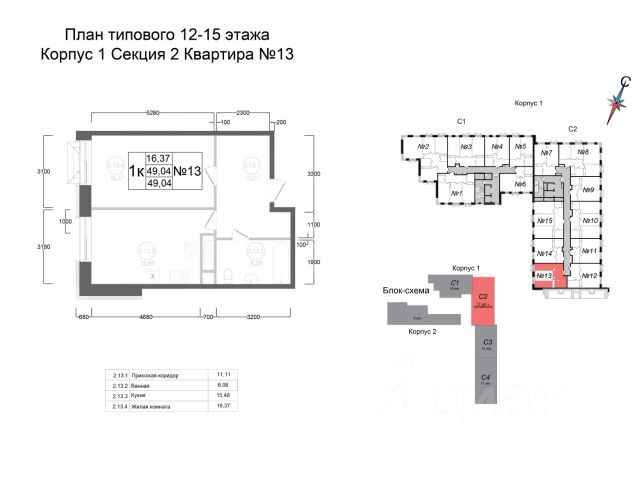 Общая площадь 43.4 кв. м, в квартире четыре больших окна и много света.