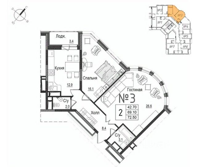 Общая площадь 43.4 кв. м, в квартире четыре больших окна и много света.