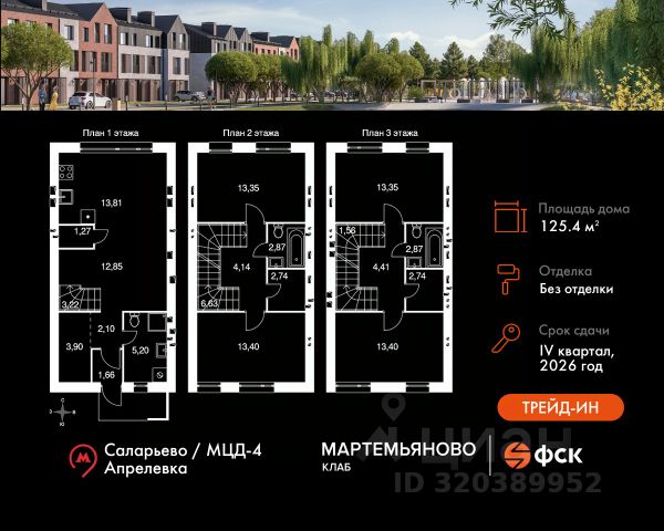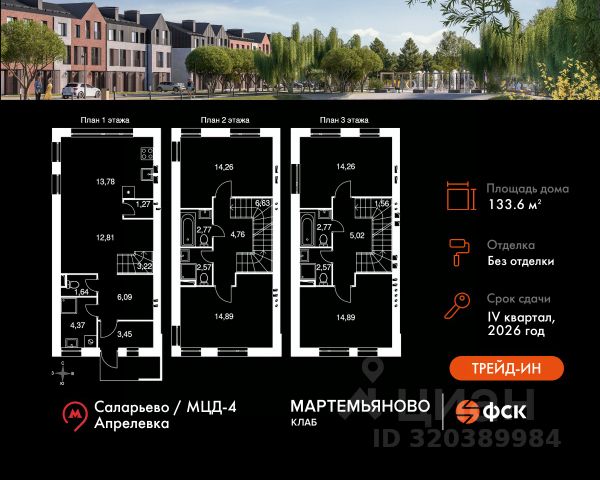 Прямая продажа от застройщика! Жилой Комплекс класса Комфорт. Продаётся 5-к таунхаус номер 1 общей площадью 133.6 кв.м. Без отделки. Особенности: - Просторная спальня, в которой можно разместить большую кровать. - Распашная планировка - отличное сочетание удобства и свободы. - Окно в ванной - натуральное освещение для уюта и комфорта. - Увеличенное число окон - Нестандартное окно - особенный акцент в вашем интерьере. - Гостевой санузел - комфорт и удобство для ваших гостей. - Душ помимо ванной - дополнительное удобство для вашей семьи. - Ниша под стиральную машину - удобство и экономия пространства. - Раздельный санузел - Евроформат - просторное и удобное жилье с отличной планировкой. - Дополнительный вход - удобство для семьи и гостей. - Можно оборудовать рабочее место - комфорт для работы и учёбы. - Отдельный вход - максимальная приватность для вашего жилья. - Торцевой - отличные виды и светлый уголок для вашего дома. - Просторная кухня - место для семейных ужинов и кулинарных экспериментов. - Просторная мягкая зона - комфорт и уют для отдыха всей семьи. - Гардеробная - удобство для хранения и организации вещей. - Кладовая при кухне - место для хранения и порядка на кухне. - Ниша под шкаф - компактное и удобное место для вещей. - Вид из окна: двор - Вид из окна на бульвар Расположение комплекса: "Мартемьяново Клаб" - клубный поселок таунхаусов от ФСК в Наро-Фоминском городском округе. Счастливая жизнь складывается из плюсов двух миров: городского и загородного. Вы наслаждаетесь свежим воздухом, лесными пейзажами вокруг и отдыхом у собственного пруда. При этом пользуетесь комфортной инфраструктурой, всеми центральными коммуникациями, собственной современной школой и детским садом. Закрытая охраняемая территория дарит вам чувство спокойствия и безопасности. А заказать все услуги возможно через мобильное приложение управляющей компании. Выбираться во внешний мир легко благодаря хорошей транспортной доступности. Транспортная доступность: "Мартемьяново Клаб" расположился в экологичном районе в 27 км от МКАД по Киевскому шоссе. Выбирайте любимую аудиокнигу, и уже через пару глав вы окажетесь в Москве. Добираться в город можно как на личном авто, так и на общественном транспорте до станций метро "Саларьево" и "Внуково". Авитомобиль: До Киевского шоссе - 4 минуты До МКАД - 25 минут До ТТК - 45 минут До Садового кольца - 50 минут Общественный транспорт: До станции метро "Саларьево" - 25 минут До станции МЦД4 "Апрелевка" - 10 минут До остановок общественного транспорта - 8 минут пешком Внутренняя инфраструктура: Сердце поселка - живописный пруд. У пруда расположен собственный пляж. Здесь так приятно проводить жаркие летние дни. А в зимние холода гладь пруда превращается в веселый каток. И, поверьте, дарит не меньше счастья. У пруда берет начало главная пешеходная артерия поселка - прогулочный бульвар длиною 1,8 км. Он ведет в лесную зону с ручьем и сам напоминает реку, только сухопутную. 3,3 га парковой зоны наполняют окружающее пространство энергией динамичных зон, которые сменяются зонами спокойствия. У бульвара есть "притоки" - второстепенные пешеходные улочки с площадками для игр и тихого отдыха. Круглая центральная площадь - место встречи и знакомства с соседями. Здесь круглый год проводят всевозможные культурные мероприятия, отмечают праздники, устраивают ярмарки или