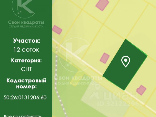Срочно! Ниже рыночной стоимости продается отличный участок в великолепном расположении, где СНТ окружен вековым лесом с соснами и дубами, Лес примыкает к задней стороне участка, 10 метров этой лесной части вглубь можно огородить четкой, поскольку это не лесной фонд, а нейтральная полоса, и пользоваться в своих хоз.целях. Участок формально имеет размер 12 соток, но по факту 25+, и это без лесной территории. Участок разработан очень грамотно, делали под себя,поднимали уровень грунтом на 2.5 см., далее смешивали плодородку с известью, все выкорчевано трактором, очищено, будет расти любая культура. Ближе к лесу оставлено место под фундамент дома, разрешение имеется. Световой столб оплачен и стоит на участке. От общей дороги СНТ вглубь участка проложен свой заезд 4м для авто и тяжелой техники с трамбовкой и бетонной парковкой. Ровно напротив участка отдельно от него имеется отдельное парковочное место отсыпаннное гравием и утрамбованное под технику типа трактора или Камаза с грузом. Это место очень поможет на узкой дороге СНТ для заезда и разворота строительной техники для будущих работ. Также напротив основного участка, зеркально от него расположен 2-й участок противопожарной просеки площадью около 6 соток и используемый каждым владельцем участка напротив ( у всех соседей есть такая опция) где можно выкопать пруд, хранить компост, сделать парковку, и.т.д. За этим участком глубокий березовый лес, много грибов. Над основным участком (12 соток) протянута резервная неработающая линия ЛЭП для г.Наро-Фоминск. Её включают для проверки на несколько часов 1-2 раза в год. В остальное время она не функционирует, радиационного фона нет. Вид участка ЛЭП не портит, из окон будущего дома ее видно не будет. Над самим домом ЛЭП не проходит (место для дома есть, разрешение имеется). Соседи только с двух сторон, соседи в СНТ отличные, председатель молодой активный, живет там постоянно, все вопросы решаются на ура. Зимой трактор чистит дороги. Вся инфраструктура в 15 минутах в г.Наро-Фоминск. Там же ж/д вокзал до Москвы. Итог - прекрасное место для комфортного проживания как для семьи с детьми, так и для пожилых людей. Место безопасное, чужие за шлагбаум не проезжают.
