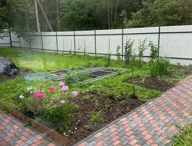 На участке лесные и садовые деревья, кустарники, газон, стоянка, участок огорожен.