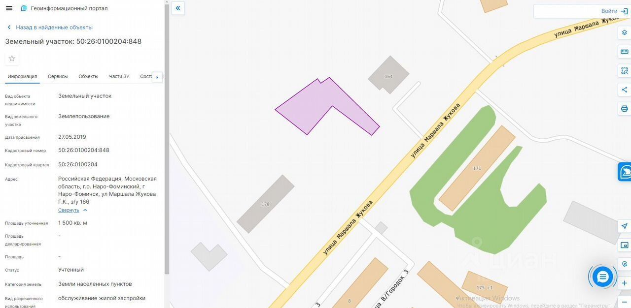 50:26:0100204:848, площадь 15 соток, (земли населенных пунктов, с видом разрешенного использования: обслуживание жилой застройки). На участке нежилое строение с адресом: ул. М. Жукова, д.166, площадью 165м2.