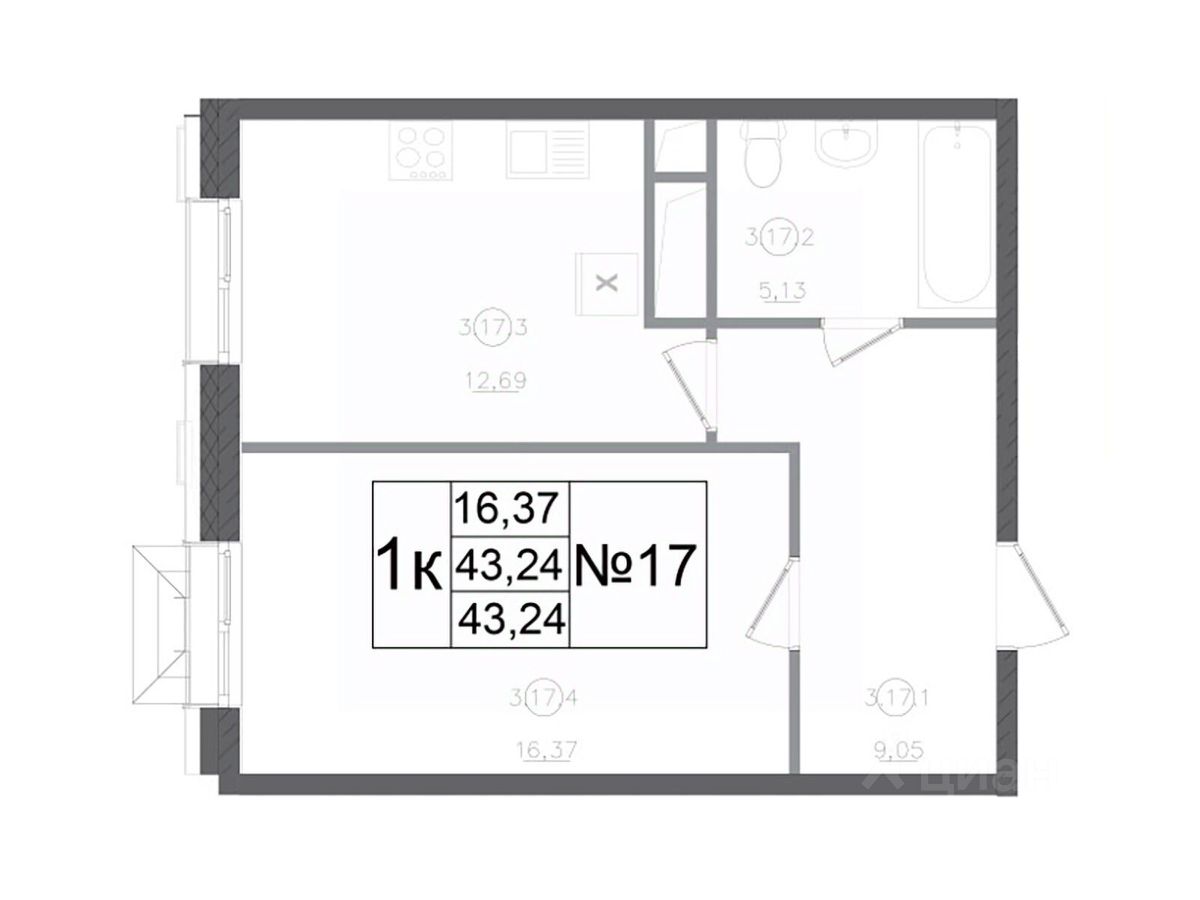 Общая площадь43,24 м²