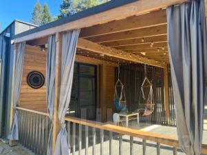 Дом одноэтажный, стены газоблок толщиной 40см, каменная вата 5см, обшит кликфальц, планкен лиственница.